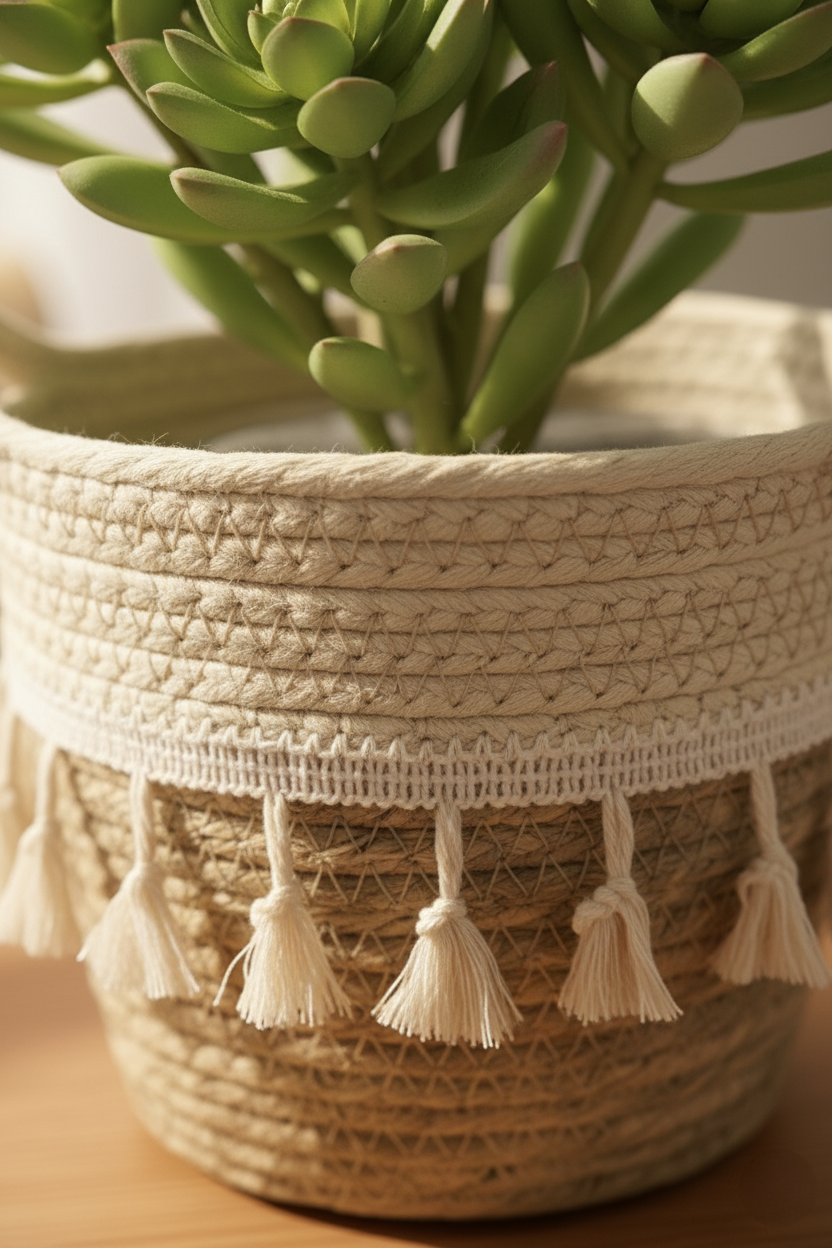 Conçu à partir de corde de papier résistante et écologique, ce panier allie légèreté, durabilité et charme naturel. Sa texture tressée et ses franges délicates créent une ambiance douce et bohème, parfaite pour un salon, une chambre ou une entrée au style cocooning.